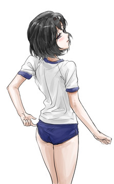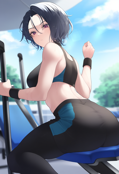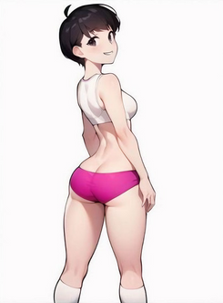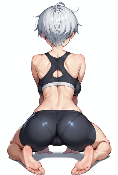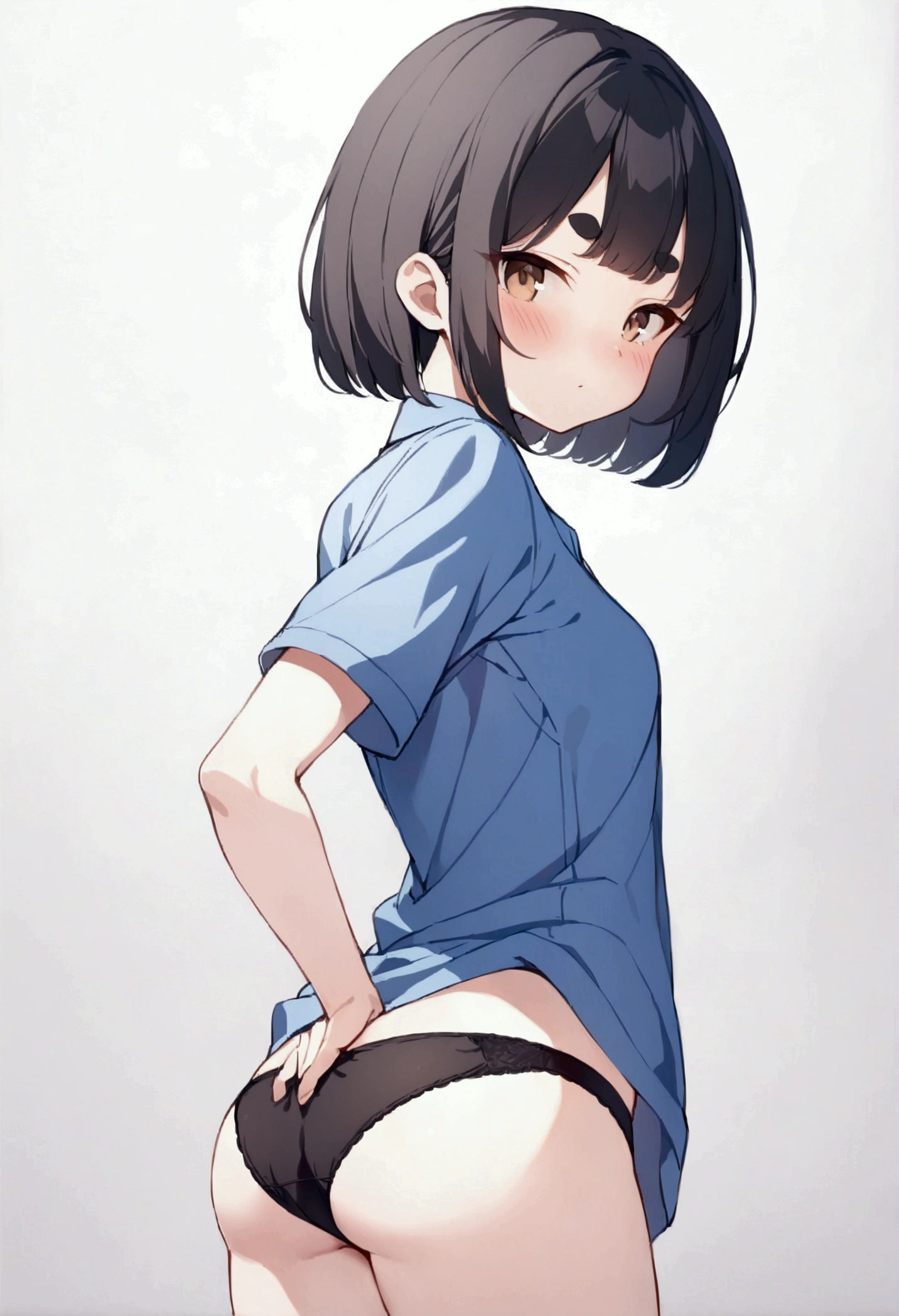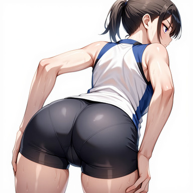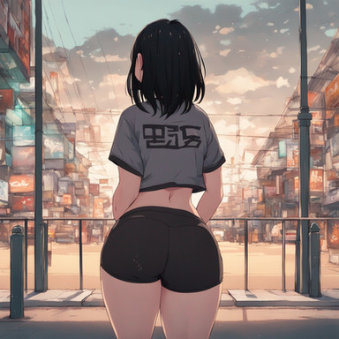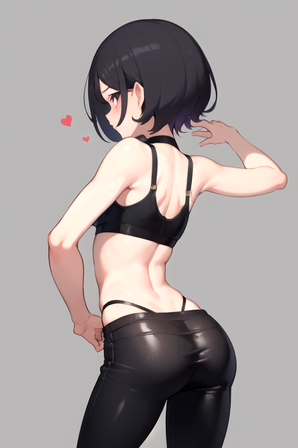 #anime #ass #croptop #lowrise #shorts #skinny #slim #black_hair #from_behind #looking_away #short_hair #simple_background #thigh_gap #tight_clothes #one_girl #back_view #dynamic_lighting