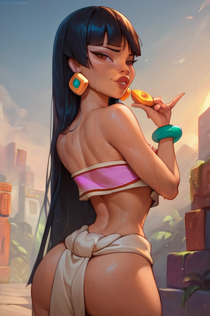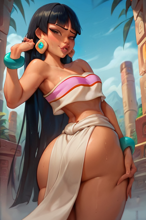 #fanart #digitalart #cartoon #ass #loincloth #long_hair #sweaty #1girl #black_hair #brown_eyes #back_view #looking_over_shoulder #off_shoulder_top #chel_el_dorado