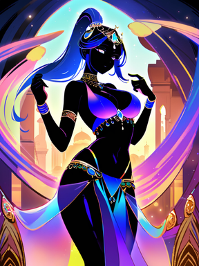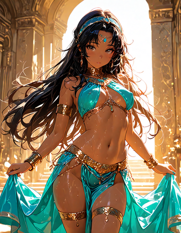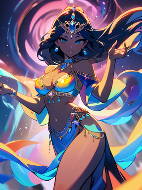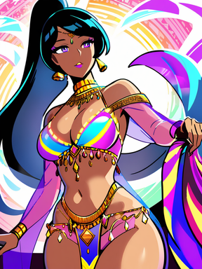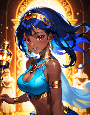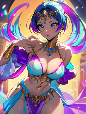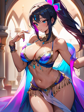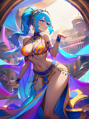 #anime #digitalart #animegirl #blue_eyes #cleavage #colorful #jewelry #loincloth #long_hair #ponytail #1girl #wide_hips #dancer_girl #looking_to_the_side