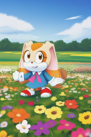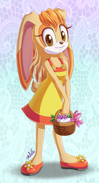 #fanart #sonicthehedgehog #digitalart #bunny #rabbit #anthropomorphic #cartoon #child #cute #dress #furry #gloves #grass #lake #mountains #rocks #shoes #sleeveless #water #wholesome #young #1girl #bunny_girl #cream_the_rabbit #orange_eyes #looking_at_viewer #floppy_ears #blurry_background