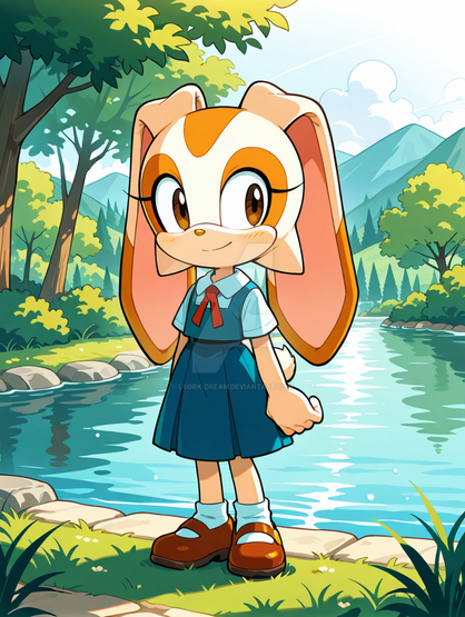 #sonicthehedgehog #bunny #rabbit #digitalart #fanart #anthropomorphic #cartoon #child #cute #dress #furry #gloves #grass #shoes #sleeveless #water #wholesome #young #1girl #bunny_girl #cream_the_rabbit #orange_eyes #floppy_ears #hand_on_hip #blurry_background
