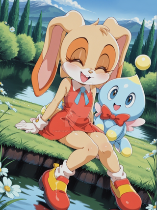 #sonicthehedgehog #rabbit #fanart #bunny #digitalart #anthropomorphic #cartoon #child #cute #dress #forest #furry #gloves #log #shoes #sitting #sleeveless #wholesome #young #1girl #bunny_girl #cream_the_rabbit #orange_eyes #floppy_ears #looking_to_the_side
