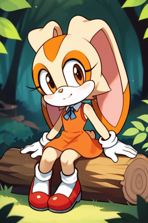 #sonicthehedgehog #bunny #rabbit #digitalart #fanart #anthropomorphic #cartoon #child #cute #dress #forest #furry #gloves #log #shade #shoes #sitting #sleeveless #tail #wholesome #young #1girl #bunny_girl #cream_the_rabbit #orange_eyes #looking_at_viewer #floppy_ears