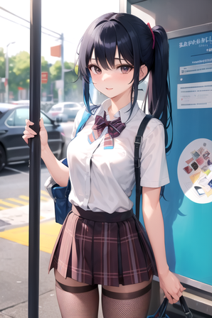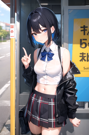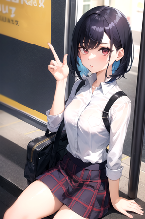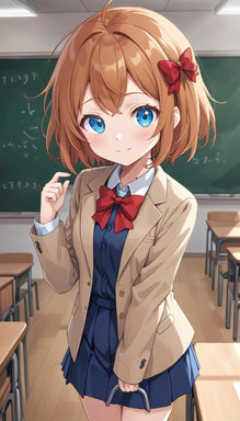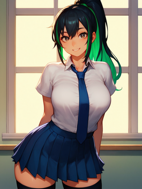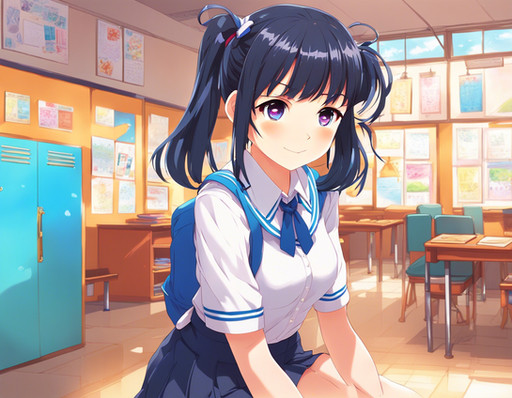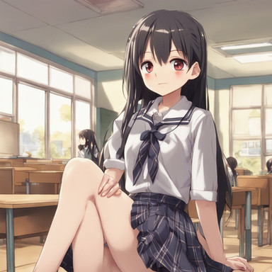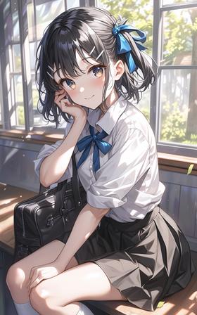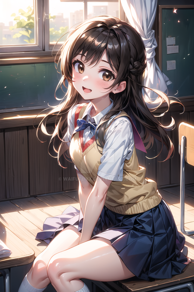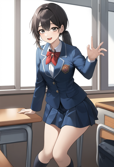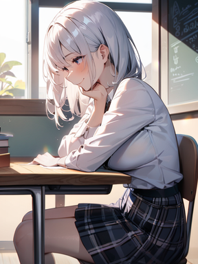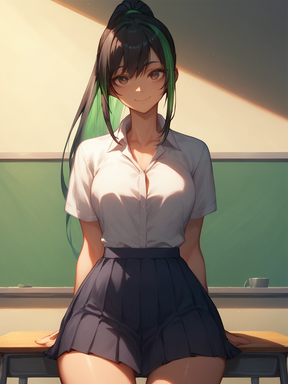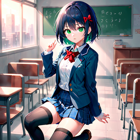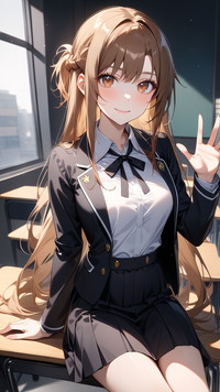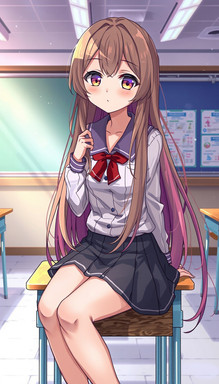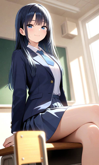 #anime #blue_eyes #classroom #inside #jacket #long_hair #school_uniform #sitting #skirt #anime_girl #looking_at_viewer #one_girl #two_tone_hair