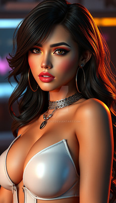 #beauty #bra #cleavage #closeup #earrings #lipstick #long_hair #brown_eyes #looking_at_viewer #dark_hair #one_girl #blurry_background #realistic_ai