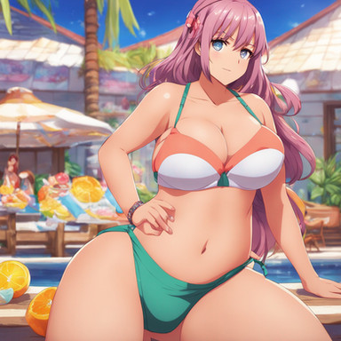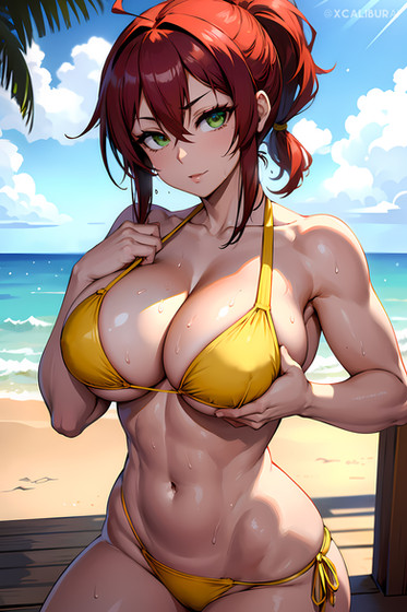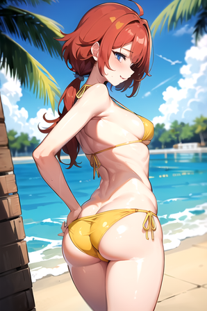 #anime #bellybutton #bikini #blue_eyes #cameltoe #cleavage #kneeling #long_hair #plump #poolside #stomach #sweaty #swimsuit #underboob #wet #sideboob #red_hair #wide_hips #looking_at_viewer #large_breasts #detailed_background #tight_clothes #one_girl #blurry_background #dynamic_lighting