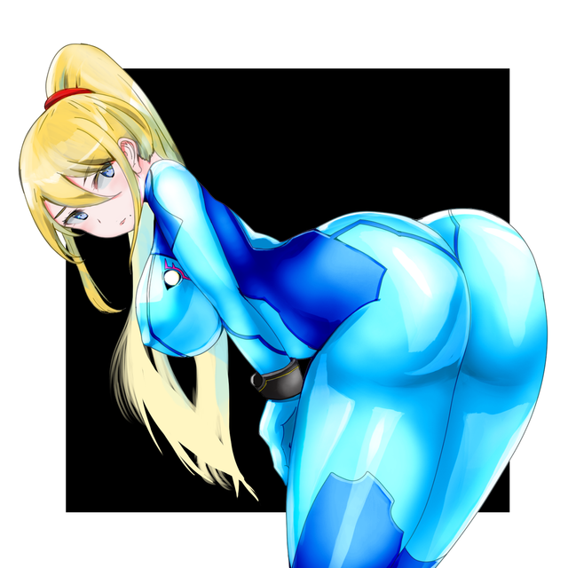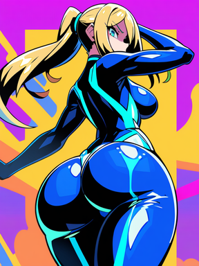 #anime #ass #bodysuit #cameltoe #colourful #digitalart #long_hair #onegirl #ponytail #samusaran #skintight #1girl #from_behind #wide_hips #blonde_hair #looking_at_viewer #bent_over #looking_back #hairtied #simple_background #small_breasts #thigh_gap #tight_clothes #dynamic_lighting #grabbing_own_ass
