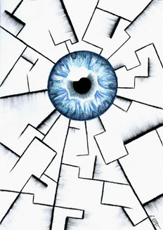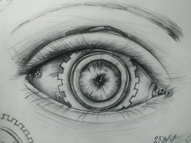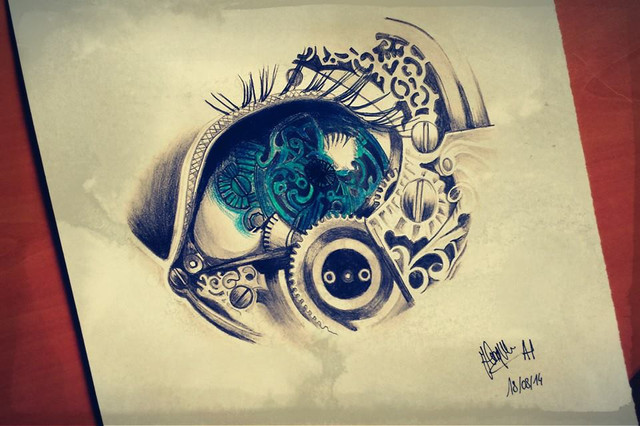 Je ne savait pas trop quoi faire au début, et j'ai opté pour le concept d'un œil avec sphincter dévoilant des engrenages. Le problème majeur était de faire un œil pas trop petit pour pouvoir dessiner correctement les engrenages sans avoir à trop dilater la pupille. Une histoire d'équilibre en somme...