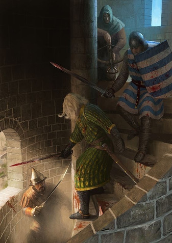 As to the situation, the tight staircase and steep stairs were the advantage the three knights needed to be able to survive and defend themselves while being vastly outnumbered. They were caught in the tower and surrounded...or so the mainstream historians believe, for the actual account, please consult the "artist's comments" section above