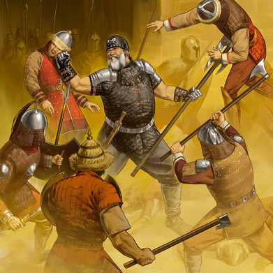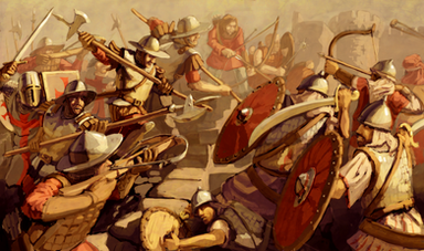 This technological and logistical nightmare often led to awkward situations. Depicted here, three Aragonese knights trying to descent a tower in Adrianopole in 1305, having collided with Byzantine infantrymen trying to go up, proceed to kill an extraordinary number of soldiers. It took a special decree of the city's ruler, prince Michael, to stop the killing. Sadly, the incident did not provoke any changes to the status quo.