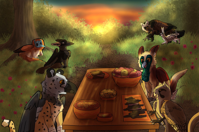 On a warm sunset, the two lovebirds Perhonen 10397 and Ace 13758 are enjoying their time while Vidar 13564 , Peach 14742 , Penny 14816 and Cassiel 1318 are waiting to see if Gauul 14709 will dare to eat one of the fruits they found.