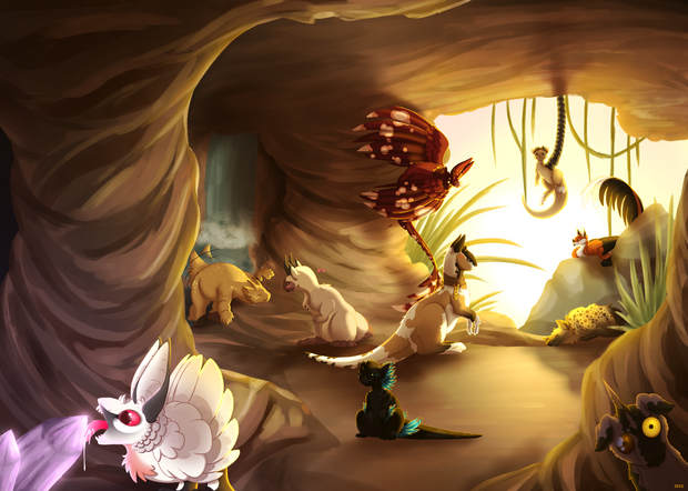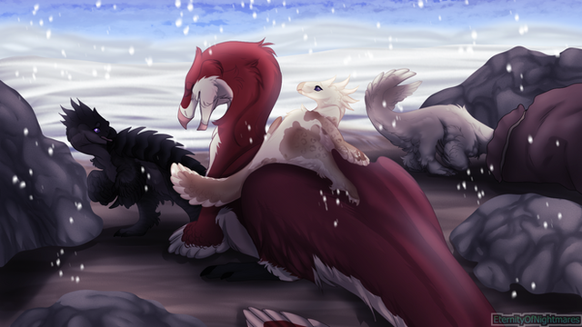 As Victor was leading Mortifer towards the village to find shelter, he came across a small creature staring at him from the ground. Upon closer inspection, the corva realized the poor warm-toned bird was stuck in the sticky wet snow."Another friend!", Victor happily chirped after rescuing the little feathered critter