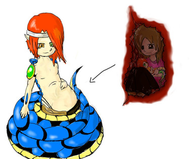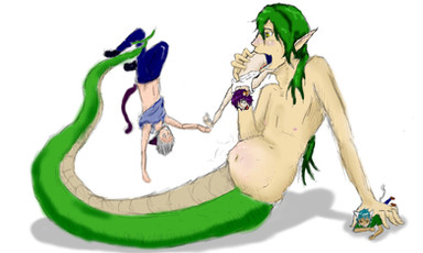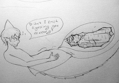 Don't forget she's in there tho, or she'll die in your stomach acids python guy. He seems blushed feeling her hands rubbing his stomach. Hey next time draw one where she's tickling him inside his belly. Just a idea.