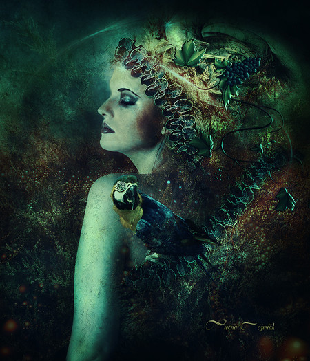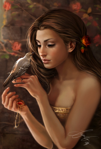 Lovely! It's amazing how much you can do with just many shades of brown! She still looks stunning and amazing. I absolutely adore how it looks like her eyes matches the falcons. And the different textures of the background, being more painted looking, vs the falcon's fuzzy look of the feathers vs. the Lady's skin and hair.