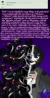 Pfft. I really need to officially update my characters and their stories. But ah well. MAYBE C would've supported Shadow Destroyer just out of hatred for Sacrosanct. But Caliginosity is the goddess of Shadow, and it is her duty to keep the corruption out of shadow, hence why the devourers were created. Sacrosanct kept the corruption out of the light.