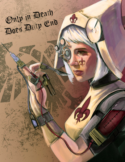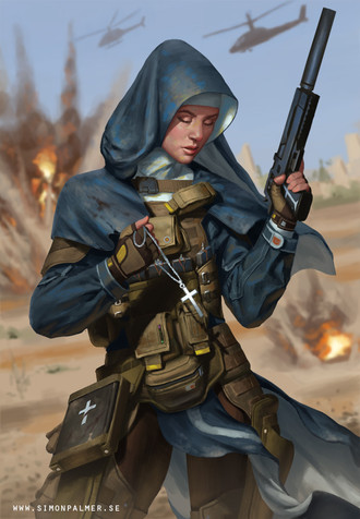 That would more fall under the preview of the cyberknights, which are totally a thing in this setting, but yeah, you're not far off. In Torg, the Cyberpapacy is a reality where a corrupt, totalitarian mockery of the Catholic Church has ruled the world since the 1300's when the French pope triumphed over the Roman one during the Western Schism (instead of the other way around as in real life). Now the Cyberpope preaches that God is on the Internet (the "GodNet") and that cyberware is a Holy Sacrament. My character was a Spanish nun who was transformed to this reality and literally reprogrammed to become an assassin for the Cyberpapacy, until the chip controlling her mind malfunctioned and she reverted back to her original personality (mostly) and joined the "resistance." If I were to convert her to D&D stats, she'd probably be a fighter/cleric, with more emphasis on the fighter. Paladin is a bit too knightly for this character.