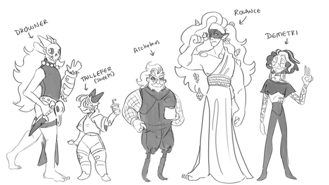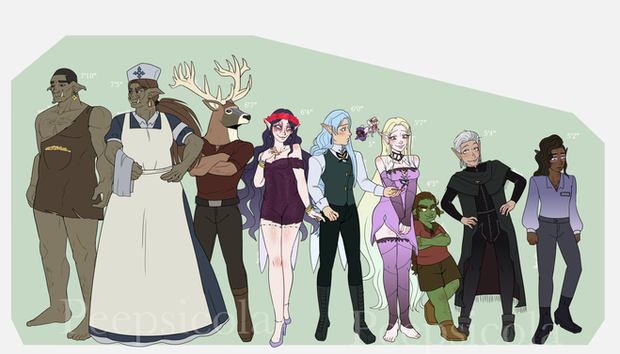 All of the characters from my character design project for school! I was really careful to make sure they had heights relative to each other that made some sense. I'm usually not great with heights and making them consistent, but one of the most fun things about groups of fantasy characters is how differently they can be shaped!