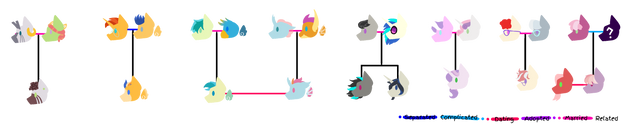 Red= Married Dark Blue= Cousins Green= Siblings Light Blue= Offspring X= Divorced Orange= Adopted____________________________________