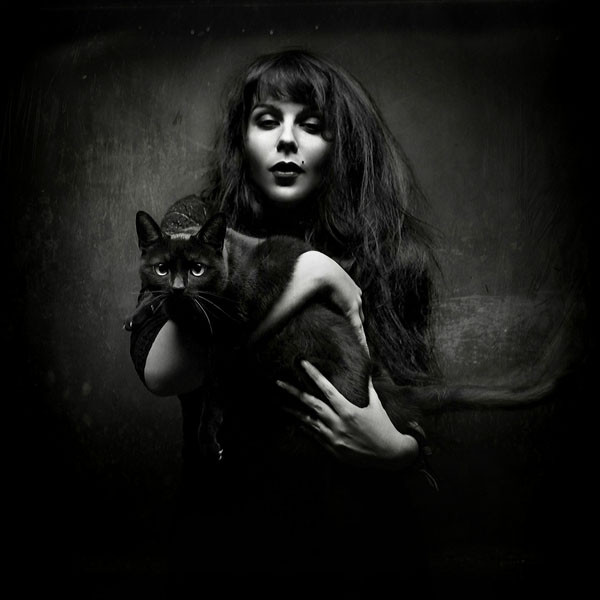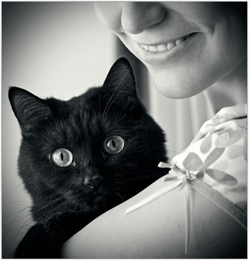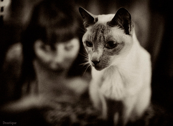A very simple photo/concept. Yet something about it, mostly undefinable I think, makes it exquisite to look at. Even mesmerizing. The intentions/emotions of the looks of both the kitty and the model are not immediately obvious, yet by no means is either face blank/boring (the eyes are amazing for each), leading the viewer of the photo (at least me, anyway) to wonder and interpret...only to then second guess. In any case, the two are inseparable, I would wager.