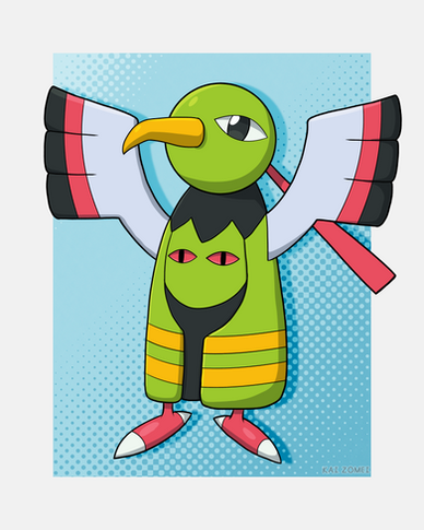 1 of my favorite Pokes in Gen II, mostly for it's odd yet unique design, if only the poor bird had a wider movepool to go with it (the others are Ampharos (for both it's tanky stats and it's adorableness), Tyranitar (Godzilla references abound, plus he's a beast depending on the stats and nature), Typholsion, Steelix (this poor guy used to be awesome, but even with a Mega Evolution it's still horrid.)
