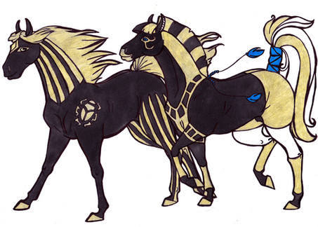 Personality: Anubis is a very quite animal. He wanders the pens, keeping an eye on the horses. When there is death, he is very solemn, and insists on being there for the burial and funeral. However, he appears in his mummy form, and usually embalms the dead one for their journey to the next life. He doesn't get along with the evil demonic horses, such as Bound Seduction. Sometimes he is seen with ancient Egyptian jackals, the animal he looks like. When he performs, he is beautiful, and radiates control.