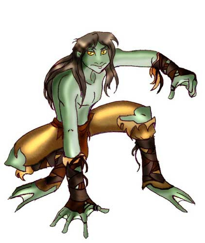 I was wondering how they keep coming up with all the necessary additions or subtractions to their clothing to work with the bodily changes. You do "curse melding" quite well, but I've seen a lot less in the way of costume design out of you. As for this lady, very nifty. I can't think of the name of the fish people from AD&D right off hand, but that was what I thought of when you mentioned the bracers in that first sketch. Sorry to say that with this one the first thought that came to mind was "Captain Kirk did a green one..." but then I've never tried to say I didn't have that sort of mind...