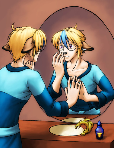 Yeah, it'd be better if I colored, but I lost the drive for that. He's tossing off his sweatpants that he slept in n.n; One of those things that needs working on ;3