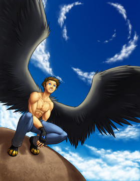 An experimental piece, I've had the image kicking around in my head for a couple days, and finally got it down on paper yesterday. Pretty simple, I was trying to play around with perspective, camera angle, and also drawing the back of Gaius's wings, as well as render them in a more realistic style. And THEN I went off and inked the things with a brush pen! The crazyness! The thing's harder to control than my nice tame micron pens, but the end result actually looks quite nice, despite being a bit messier than my usual stuff. I might try using it a bit more in some future stuff, but only on larger details, it can't handle thin lines well at all.Related content