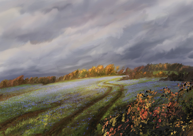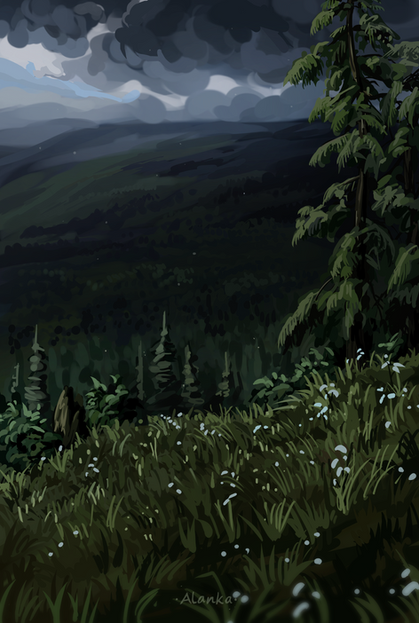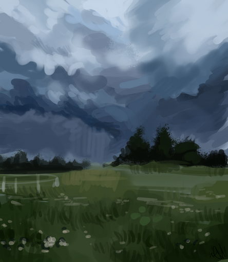 You created an amazing atmosphere. The lightning bolt in the distance, dark clouds - everything fits the title. And those clovers on the ground - that must have been a pain to draw. Again, amazing job.