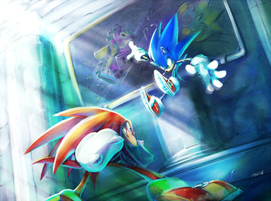 Liking the light effects and the Death Egg in the background. This picture really does give off a sense of both Sonic and Knuckles being unstoppable. Looks like both Sonic and Knuckles are going to infiltrate the Death Egg in order to destroy it.