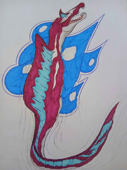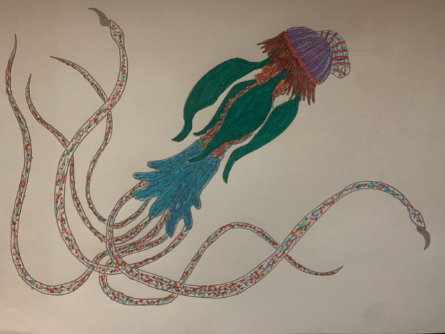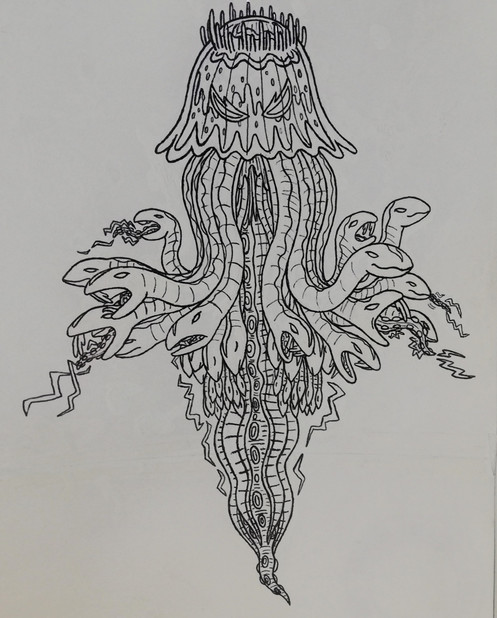 i went for a Jellyfish design due to the whole "made of 95% water" thing, but i wanted to spice it up a bit and drew some shark influence in there with the jaws and shape