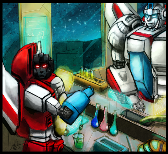 LOL I hope the table isn't hurt too much! Well, I've always thought Skyfire is such a vulnerable character when NOT in battle (after seeing him dogfighting and wrestling, I would never want to really piss him off, thank you very much)...but he is almost always the top when I come across a fanfic of him. Looking at his size, it's understandable - heck, I also crave for him topping Ratchet someday - but I really want to see him being blushy and timid all the while so...yeah. Truth to be told, this started out as a IDW-headed Skyfire...which then insists to have glasses on...which then somehow got skewed when sketching it...which then leads to Ratchet in the picture causing the skewing. LOL, my head is really twisted!