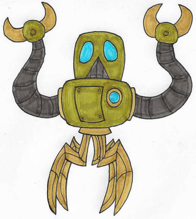 Cauldrones are metal, golem-like creatures that were created by a mysterious witch, one whose name has been lost for decades. Standing ten feet tall, these formidable creatures have an intimidating appearance. Their metal fists and heavy bodies look like they can smash through stone walls and crush opponents with ease, but such violence is not their true purpose. Cauldrones are actually collectors, scouring the land for ingredients. The palms of their hands and bottoms of their pillar-like feet can open up to suck in fluids and small objects. The force of the suction is enough to pull in even the thickest of liquids, and their foot holes can leech away all nutrients from the surrounding earth in a matter of seconds. Absorbed fluids, nutrients and energy is then instantly separated and stored in individual, glass bubbles that cover the arms and chest of the Cauldrone. Once full, the Cauldrone will leave and return to the witch's lair, dumping its load and heading back out for more. A Cauldrone may be "programmed" to seek a specific ingredient for the witch's brew, or may be sent out to collect anything and everything it can find. But that is not the extent of their use. The opening on their back is actually a portable cauldron of its own. The cauldron is always filled with some strange, bubbling liquid, sloshing about as it moves. The bubbles and tubes within the Cauldrone are all linked to the cauldron, which it uses to brew its own spells. Cauldrones all have knowledge of basic potion and magic brewing, which they use on their own free will. When brewing, it pulls from its internal store of ingredients and feeds them into its back cauldron. With some body movements, it stirs the brew and unleashes whatever spell or creation it has made up. One can tell when a Cauldrone is brewing, as the glass orbs it uses will briefly glow when being used, giving off a brief light show before it strikes. When the liquid boils and bursts, that is a sign to get away.