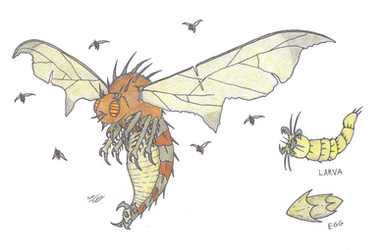 While Cukalids are large, bloodsucking insects, this is not what has made them so infamous. Rather, it is their reproductive cycle that makes people so fearful and disgusted of Cukalids. After a female and a male Cukalid mate, the female begins the development of two to three eggs. While other insects may lay these eggs and leave, Cukalids will actually keep them safe in their armored abdomen, refusing to lay them until they are almost ready to hatch. When the time comes, the female will finally release the eggs and guard them until the larvae emerge. Two to three larvae will be born, and their mother will pick them up and carry them on her body. What comes next is rather interesting, as Cukalids are brood parasites. Rather then care for them on her own, the mother will seek out large, blood-filled prey to help her out. Once she spots a suitable target, she will strategically place one of the larvae on the host and keep watch. Once planted, the larvae will dig in their legs and reveal a long, forked tongue that is used to pierce the prey's skin. Sliding this branching tongue under the skin, the larvae will begin to slowly feed on blood and other fluids. Its legs help anchor itself to the host, while the strange tongue makes removal difficult and painful. When the larvae is safely secured, the mother will fly off to plant the other siblings. The young will remain on the host for days, gaining strength and energy from its victim's blood. Now one may wonder why the host just doesn't squash the little bugger, as it would seem like an easy solution. The reason this doesn't happen is because while the larvae steals blood, it is also injecting something else into the host. This strange fluid (maybe venom? A tranquilizer?) causes the victim to become oddly motherly to the attached larva. Like how a mother lovingly cares for her child, the host will begin to act much like that, seeing this parasite as their own offspring. Even when the host is male or another gender, their behavior will change so that they care for and protect the parasite. Over the next few days, the host will become infatuated with the larvae. Any attempts to harm the parasite or point out that it isn't a real child will cause the host to lash out angrily and violently. This behavior is even seen in species who do not care for their offspring or interact with them in any way. When someone is being fed on by Cukalid larvae, it is pretty much impossible to convince them it is a parasite and not some precious baby. After a while, the larvae will have gained enough nutrients to begin pupating. When the host falls asleep, the young will remove itself from their body and crawl off to a nice, dark, safe place. There it will cocoon itself and begin the process of becoming an adult. When the larvae leaves the host, the host will wake up with no recollection of the past few days. Their memories of their time under its influence will be blurry, and some may even write it off as a drunken stupor.