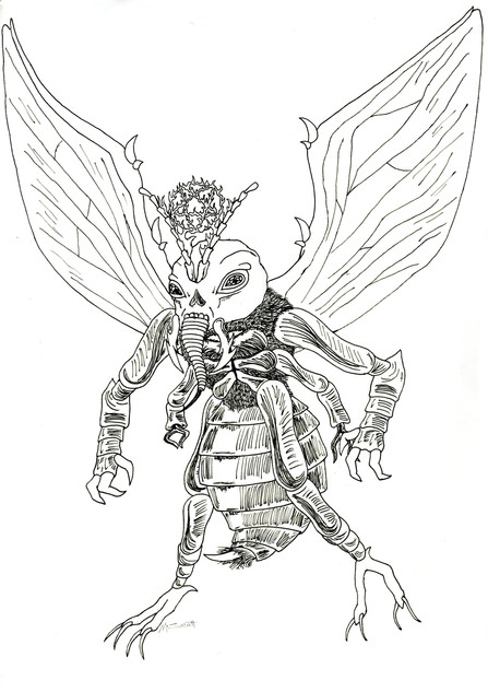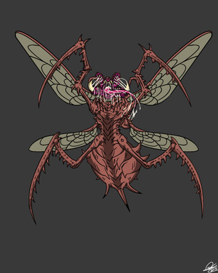 While I have talked a lot about how the term "dragon" is thrown around a lot and misused, the word "vampire" is another one that suffers such a fate. The "Dragon" label is slapped onto any giant, dangerous creature, and the title of "vampire" is used whenever a species or entity feeds on blood. As you can clearly see, these requirements for such a title are very vague. So often they are slung around with reckless abandon, to the point where such names hardly mean anything. The moment some culture or group learns that a creature feeds on blood, they instantly start calling it a "vampire." For a natural historian, such as I, it is extremely confusing. You will go to some town and have people raving about "vampires," and you go to investigate only to find that it is a roost of small blood sucking bats. This is the other problem with calling everything a "vampire," as it instantly demonizes whatever species it is used on. These bats hardly drink enough blood to cause harm, yet people are ready to slaughter them just because they believe they are bloodthirsty beasts. Real vampires are real problems, as the human host is reduced to a feral state that makes them extremely aggressive. Vampire outbreaks can wipe out towns, which is why vampires are so despised and hunted. This level of threat and danger shouldn't be thrown around so sloppily. What if a band of knights come riding to a town under the belief that they are besieged by vampires, only to find out that the townsfolk have been panicking over large mosquitoes? It would be such a waste of time and resources, while real vampires are out infesting others! What I am trying to say is that we should watch our use of the term "vampire" so that innocent species aren't demonized and natural historians can keep things straight. The reason I bring this up in this entry is because the species I am writing about is often called a "vampire." This is obviously a false title. Yes, is does feed on blood, but it does eat other things! And yes, it is a little creepy looking, but that still does not mean it's a vampire!The species I am referring to is the Cukalid, a large species of flying insect. These creatures are quite hardy and well adapted to their environment, allowing them to live in a wide variety of habitats. They prefer temperate to tropical climates, and the only real thing they need is trees for roosting. Cukalids are a nocturnal species, going out to hunt around dusk and retreating to the cover of trees when the sun rises. Despite this lifestyle, they are not vulnerable to the sun. Its rays do not burn them like one would expect for a "vampire." Rather, night is when their prey is easier to target and ambush, while daylight makes their attempts rather obvious. Stalking prey during daylight hours would be difficult, as Cukalids grow to the size of an adult human and are red in color. Kind of hard for prey not to notice something like that. Though their limbs can allow walking and crawling, Cukalids prefer to travel by flight. Their large wings allow them to zip around rather quickly, or hover in place so that they may scope out an area. These wings are designed to be silent during flight, making it easier for them to sneak up on prey. To go with this lifestyle, Cukalids have specialized limbs. Their lowermost appendages have backward joints and dexterous hands that aid in perching and snaring small prey. Their middle appendages are fused and spiky, which they use for holding larvae and grooming. The upper limbs are much like our own arms, allowing them to grasp tools, prey and larvae. And if six limbs aren't enough, their proboscis is prehensile! So many options!