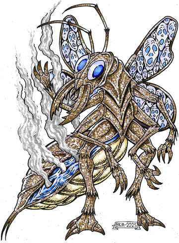 As you can imagine, such a life cycle has made Cukalids a terrifying creature in the eyes of many. Tales of them swapping out babies and preying on sleeping victims are plentiful. To make things even worse is its appearance. The devilish red, the cruel tongue and that bizarre visible brain. To this day, no one is really sure why the Cukalid has such a large, obvious brain. Compared to other insects, the Cukalid boasts the largest brain to body weight ratio. Some believe such a large organ is what gives Cukalids such cunning and cleverness. Though I did not state it before, but Cukalids are rather smart little bugs. They can open doors and windows, sneak into locked areas and plan out attacks so that they maximize success and minimize failure. This also helps when planting their young, as they choose hosts that will provide proper safety and food for their larvae. Even with this, though, their brains seem too big. Other insects are good at planning and hunting, and yet they do not possess such large brains. Giant ants are quite smart and clever, but their brains are tiny compared to the Cukalids! Another theory is that the Cukalid's brain makes them immune to magic. This I don't know much about, as I am not educated in such a department.