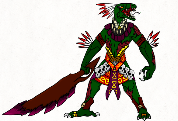 Just by looking at them, you can easily guess that the Furceros are related to the Cyclops. Both are single-eyed reptilian creatures who possess tusks and the ability to change the color of their hide. In fact, certain cultures refer to the Furceros as "Lesser Cyclops," as they are smaller and much less aggressive than the massive Cyclops (do note that the Furceros are not a fan of this name. Being referred to as "lesser" is not something they enjoy). They can also be found in the same areas as the Cyclops, though they tend to highly prefer the tropics and jungles. The key differences between them and the Cyclops are their long, thin legs, prehensile tail and sticky tongue. The long limbs help with climbing trees and thick vegetation, while their tails aid with grappling and also serve as a kickstand! Unlike the Cyclops, whose tongue is reduced and trivial, the Furceros possess a sticky tongue that can reach out almost two feet! While this is not as impressively long as other chameleons, it is meant more for probing cracked exoskeletons and pulling in food past their long tusks. These pointed teeth are good as tools, but they often get in the way for eating, so their long tongue helps fix that!As I mentioned, the Furceros are one of the main sapient denizens of the rainforests and jungles. They place their homes deep in these dense forests, to the point where it is incredibly difficult to locate them unless you have a map or are extremely lost. Due to their preference for the deep jungle, outside cultures are suspicious of them and see them as a secretive and insidious group. Some believe that both they and the Gralatars are the defenders of the ancient ruins and temples hidden within, and that any explorer who vanishes during a quest have most likely been slain by these "beasts." While Gralatars are seen as trap-makers and hunters through trickery, the outside world sees Furceros as deadly assassins. Due to their ability to change the color of their skin, the Furceros are believed to be able to become practically invisible in their jungle home. Tales speak of unseen foes who come from all sides and drag poor souls into the deep brush, never to be seen again. Beings like ghosts that drop from above and then vanish with their victims like smoke. Ask any common person outside the jungle about the Furceros, and they will speak of invisible assassins and vicious specters that defend their forest home. While these stories are indeed spooky and chilling, they are also 100% garbage. It's almost funny how wrong people have it about the Furceros, because if there is one thing the Furceros despise more than anything, it is the idea of blending in.