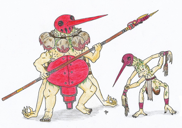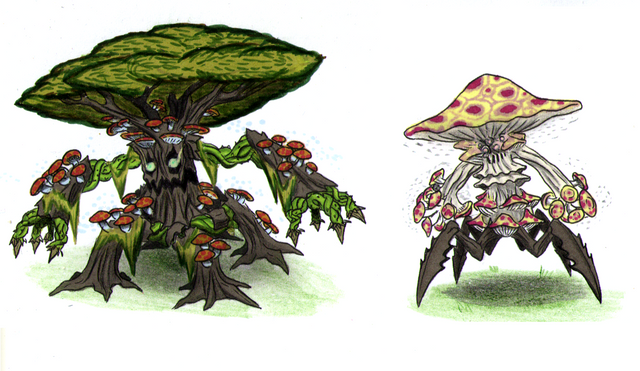 When it comes to the jungle and rainforests, there are always mention of primordial tribes that live within the dense vegetation. Civilizations that have existed for centuries without the outside world's knowledge, entire societies coming and going with nary a word. Those who dare delve into these deep forests may find ruins of these ancient times, but unlike our world such places are not left to rot. Much like the jungle, life and death is a constant flow, and there is no time for dwelling on the past. The husks of these old societies are used by those that live now, using whatever they can to survive in these harsh land. Long ago, these lands may have been ruled by some other species, but today, the jungle belongs to the Gralatar and the Furceros. This entry, though, will be focusing on the Gralatar!Though their appearance may be confusing at first, Gralatar are actually a species of large spiders. They possess the eight limbs and two body sections that other arachnids have, but they carry themselves in quite the unique way. Rather than walk on all eights, they use their front four limbs as legs, and the other four as arms. They walk with their heads faced downwards, while their abdomens are raised up in the air. People may not realize this at first, though, as their unique patterns give quite the different impression! The coloration on the abdomen of a Gralatar gives the look of a face or some mask-like visage of one. With their abdomens raised into the place a head should be, most people mistake these patterns as their true face, which has led to years of confusion and misinterpretation. For a long period of time, the Gralatars were seen as a tribe of demonic masked warriors, as people were not aware that their true heads were much lower. I would say that such a belief is silly, but it turns out that the Gralatar's body shape is designed to give this impression! The false face is meant to throw predators and attackers off, making it confusing on where their line of sight is. It also causes foes to unintentionally target the abdomen rather than the head during a fight, which draws attention and fire away from their weaker section. Attackers who drop from the tree limbs down will also wind up hitting the abdomen before the head, giving the Gralatar time to retaliate. It is quite a design, though it still kind of throws me off! I can't tell you how many times I have found myself trying to converse with one and have wound up trying to make eye contact with their rear.