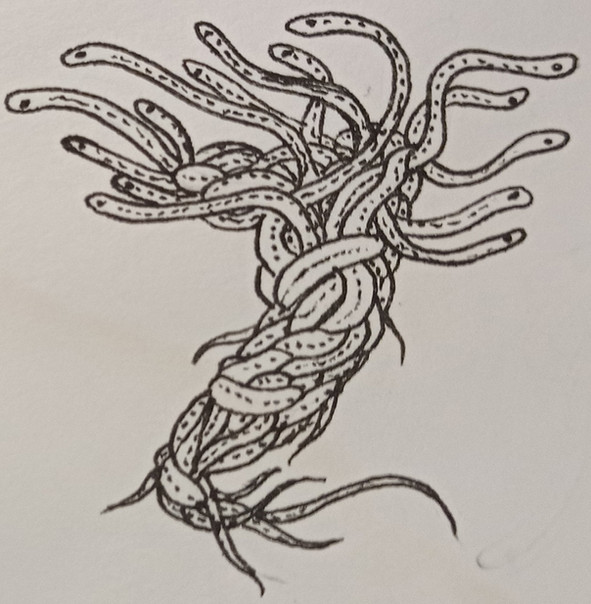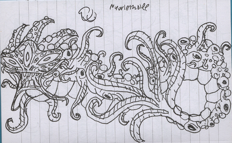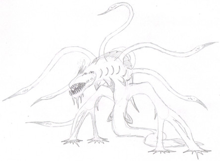 The Hydra is another beast that I like, so I was curious to see what odd combination would make a fitting image. Parasites like tapeworms were what I was going for, but I kinda got lazy and made a bunch of easy-to-make heads. Making some unique, detailed head is hard when you have to draw it over and over.
