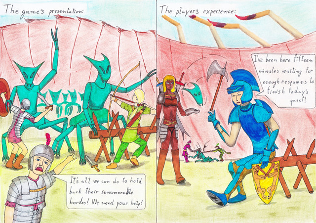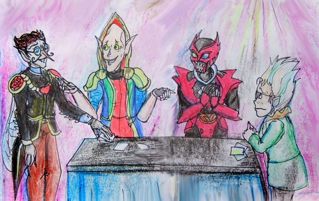 Since the knights have nothing much to do until someone hires them, the group seems to have an obscene amount of free time. Sure, one can clean up the place, help patch up the barn and do a little gathering, but at some point you really run out of chores to do. After all those things are done, the knights have to find something to keep themselves busy. For some, there is reading, chatting, drawing, hunting and other fun stuff, but for Korgin, it's games. The fairy seems to have brought an impossible amount of board and card games with him, and is always eager to find someone to play with. Most of the time, not many are willing to play, and Korgin believes it is because he is too good at them and everyone is afraid of losing. The real truth, though, is that Korgin is quite the boisterous winner and sorest of losers. If he isn't laughing about his lead, he is whining about his losses, and many can't put up with it for long. Thankfully, if enough people play these games at once, they can at least dilute his bellyaching and boasting. Today, Merrill, Osryx and Vikus finally caved and decided to join Korgin in one of his favorite card games. Telnus was pulled along against his own will and Coat of Arms kind of just showed up at the table. Turns out that Feasts of Beasts is a pretty fun card game, though Korgin is getting into his whiny mood again. He can bellyache all he wants about Merrill's play style, but he should probably realize soon that the coat rack is the one who is currently winning the round...---------------------------------------------------------------