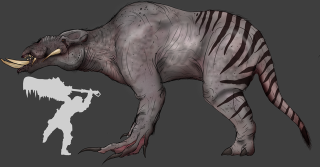 This species lives in grasslands and savannas, stalking through the fields in search of prey and making nests from gathered grasses. They live in groups, with typically six to ten individuals in them. Keythong are highly social with each other, working together to hunt, raise their young and even partake in social grooming. When resting, they have been seen cleaning each other's spines, taking care of areas the individual cannot reach. When on the prowl, they act much like wolves, coordinating their attacks and ambushes. Low clicks and quiet whistles are how they communicate with one another, arranging the perfect trap to corner prey. When the time is right, an individual will rush out to scare their target and flush them into the waiting talons of the others. Sharp beak and claws tear at prey, and they will even use their large bladed shoulder spines against larger animals. A frequent strategy is for them to slow their target and then dash under the prey's stomach to gut them. When prey is brought down, the group will finish them off by clawing open the throat. The hunters shall dine upon their kill, eating as much as they can. When they are satisfied, they will usually have meat left on the carcass. Rather than protecting their kill or abandoning it for scavengers, they will tear off the big chunks and spear them on their spines. This is typically done with teamwork, with one standing still while the others load them up with pieces of meat. This is all carried back to the nests, for either later consumption or to feed their young (typically called "cubs). The newborns will be fed regurgitated meat, since they are not strong enough to tear through flesh. The slightly older ones will feed on the brought back meat, picking it off the adult's spines so that it is easier for them to tear off pieces. Once all is consumed, then the social grooming and preening begins. Best to clean off all that blood and viscera!