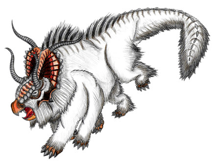 To be fair, keythong don't get brought up a whole bunch because of their odd name. It is not a common one heard around the taverns or schools, so when someone actually says it, folks think their tongue just slipped. And if it doesn't have "griffin" in the name, then how can it be a griffin?! Well, in truth, it isn't exactly a true griffin, but a close relative to them. Their lack of big ol' wings kind of makes that a bit obvious, and another reason people don't think about them a whole bunch. Birds as a whole get a lot of love for their wonderful wings, and losing those means losing points for some people. I don't agree with those people in the slightest, but I can't ignore the fact that that is kind of a thing. Flying? Now that is wonderful and special! Walking? Everyone can do that! And indeed, the keythong is a walker and not a flyer. Their third set of limbs that were once wings have long since been lost. Like griffins, they do still look like the fusion of a cat and bird, but one without wings. A beaked head, fore legs with talons, feathers and down so fine it looks like hair. And a whole lot of spikes. If keythongs lost their wings, then they made up for it in spikes. Bony spurs running down their backs, erupting from their shoulders, lining their legs and even barbed feather shafts giving their tails a spiny look. They bristle with this weaponry, making a pretty iconic look! At least to me!