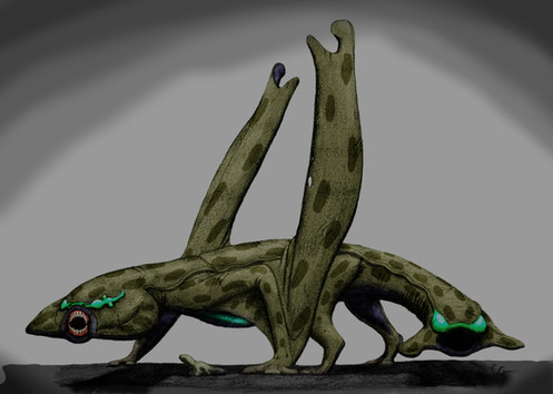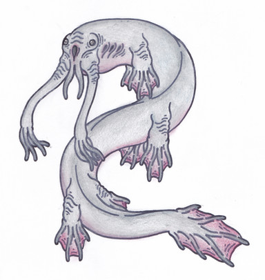 I am sure there are some people out there surprised to hear that the Underworld has lakes and rivers. According to many tales on the surface, that land down below has replaced such water bodies with fire and lava. While it is true that some regions have magma pools and fiery springs, the majority of the Underworld has water just like us up above. Some of these bodies are so big, that they almost act like oceans! I bet you never thought that the Underworld would have coastal towns! They are definitely a sight to see, and they bring with them an equally amazing amount of flora and fauna that you find on the surface. One of these interesting species is the Klost.Klosts are freshwater dwelling creatures that are mainly found around pools, lakes and rivers. They possess slick, wet skin like a frog or salamander, which means they thrive where ever there is moisture. Due to the structure and environment of the Underworld, some regions are constantly humid and damp, which allows some Klost to live in areas without major water bodies. A set of gills allows them to breathe underwater, but they also have lungs so they can breath normal air. Due to their amphibious nature, they spend half of their lives out of water and the other half in it. With this in mind, their anatomy is built to let them maneuver on land or underwater. A pair of webbed forelimbs are capable of acting as arms or fins depending on the situation, and they are often used to manipulate objects or food. Three pairs of fins line their lower body and they help provide propulsion when the Klost is swimming. On land, they act as crude legs, pushing the Klost along as it slithers across the shore. They are not nearly as fast on land as they are in water, but thankfully their food doesn't run all that fast.