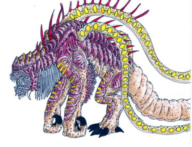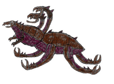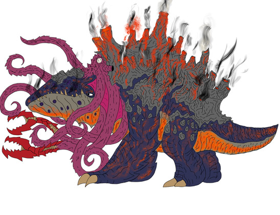The frequent attacks from the beast known as "Vish'El" left the world in chaos. Despite all technology we had created, all the weaponry we built and hoarded, we were powerless to stop it. We let loose enough firepower to last three wars, but the creature hardly seemed to flinch. At times it would act like we hurt it, but then when we stopped to observe or swooped in to take advantage, it would let out that weird shout and send us all flying. Nothing marred its impenetrable skin, so all we could guess was that it was playing pretend in order to trick us. No clue why that is necessary, as it could carve through our armies in seconds without suffering a scratch. All we could do is keep running to the drawing board and try to think up of some new strategy or weapon that could take it out. Until we found its weakness, humanity just had to accept the fact that our cities were just open season to a sudden monster drop in. No surprise so many people fled to the countryside once they figured out their governments couldn't stop the thing. Everything became a nightmare, and we were all lost on what to do. So imagine our reaction when another one of those wretched things suddenly appeared.It showed up a little after Vish'El dropped in and started stomping an empty city, arriving in the same bizarre manner. It was obviously a different creature, no doubt some other cosmic species of titan, but there were some odd things we immediately noticed. This one moved a bit more fluidly, though still had a bit of an awkward gait and pace. Its mouth seemed to function more than Vish'El's, so much so it seemed to constantly be flapping open and closed like a chattering crocodile. This beast too seemed like a noisy one, as it liked to roar just as much as Vish'El, though it was a bit different. While Vish'El's were strange variations of the same sound, this fellow seemed to have only one noise that it could duplicate perfectly. That strange metallic howl just over and over, constantly repeating in a deafening loop. It was bizarre. When it arrived, our hearts stopped. Another monstrosity just entered the ring, what hope did we have now? The appearance of this intruder seemed to upset Vish'El as well, as it stomped and screamed in a furious tantrum. Without warning, the two launched themselves at each other and fought. They slammed together with incredible force, shaking the earth with the impact. Neither seemed too fazed by the collision, as they backed up and did again. And again. It was a strange fight to behold, as they just rammed into one another again and again. They would roar and scream, sometimes stumbling or getting their limbs locked, but they would eventually regain this position and continue to bash their heads together. Once in a while, one would hit the other with an awkward tail swipe, sending the opponent tumbling, but then they would just get back up and charge in. We watched the brawl closely, hoping that it would reveal some secrets to us.