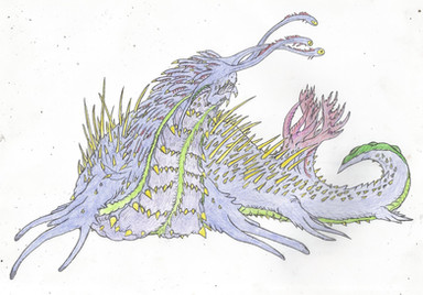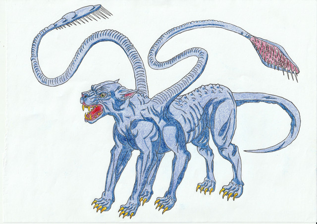 Coating their long tail are dozens of razor-sharp spines that contain a paralyzing venom. While this appendage could physically strike a foe to take them down, the manticores prefer a more long ranged approach. The spines that grow from the tail have very thin bases within the flesh, giving them a rather poor anchor. The muscles that surround them can actually tighten around the spine and snap the base in half, causing it to become loose and fall out. When a manticore whips its tail towards prey, its muscles will break these spines at the right moment to cause them to fly free from the appendage. The result is a spray of spiny shards that will slice or embed themselves in prey. This attack is not very accurate, but with the amount of spines that are launched, it usually results in two or three hitting the target. Even a glancing blow is good, as just a drop of their paralytic venom will slow prey down and weaken them. After the initial attack, the manticore will let the prey flee, waiting for the venom to take effect. Within minutes, the victim will tire themselves out and succumb to its effects. A few glancing cuts from their spines will result in weak limbs and difficulty breathing, while full penetration from a few spines will cause full blown paralysis. After the prey falls, the manticore will stroll over and assess their meal. If the victim is still moving and kicking, it will unravel its facial tendrils and jab them with their venomous barbs. This will inject a lethal dose, which will shut down the lungs and cause asphyxiation. If prey is full paralyzed and still alive, the manticore won't bother with adding more venom. Their mouths will stretch out from their head shells and distend. Made of strong, flexible flesh, their maw is capable of opening to incredible sizes, which they use to engulf fallen prey. Hundreds of tiny sharp "teeth" will bite into the victim to hold them in place while it slowly swallows them. This act takes several minutes, or even longer depending on the size of its prey. It will swallow them whole, transferring them into a stretchy stomach that can hold the huge load of food. Their unarmed underbellies will swell and balloon, giving them a rather fat appearance after a meal. With a full belly, the manticore will seek out safe shelter and go into its resting state. During this time, they will lay in on spot for days ir weeks on end, slowly digesting their food. Predators or attackers who approach them will get a face full of spines, as they lash their tail out at anything that approaches them. If you know someone who is quite ornery when you try to wake them from their slumber or get them out of bed, then you now know why people jokingly compare these folk to manticores.