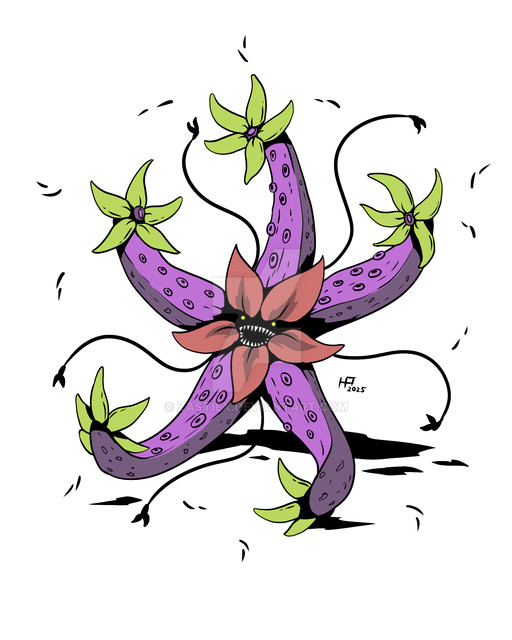 If you were crazy enough to get a closer look at these leaves, you would notice a vast amount of pores dotting their pink surface. The faint shine of liquid would reveal to you a glue-like substance that leaks from these openings. The hand-like arrangement of leaves are absolutely soaked with this adhesive, which is useful for catching food. Manus Blooms are carnivorous, using their colors and sticky fluid to trap insects and other small critters. It is why their flower is kept far away from their leaves, so that their pollinators don't fall for this trap. Other creatures will see it as just another plant, or be lured in by the sweet smell they give off. Some folk suggest that even the shine of the fluid may fool some prey into thinking there is water trapped in its open leaves. However they are lured in, they will soon find their doom if they make contact with the leaves. The fluid is a potent glue, and it gets prey stuck real fast. Most attempts to escape from its grip only causes them to get further coated in this mucilage, ensuring there is no escape. To help speed up the process or snare prey that is too wary, the Manus Bloom will manipulate its own leaves like fingers, grabbing nearby prey or squeezing them in folded leaves to further coat them. The serpentine stalk lets them coil up and launch themselves at quick speeds, perfect for nabbing victims that refuse to get close. Once prey is caught, the secondary effect of the mucilage will reveal itself. The fluid isn't just a glue, but a digestive enzyme, and a potent one at that. It will begin to eat through prey like acid, melting them down so that their nutrients can be absorbed by the leaves. Hopefully prey suffocate themselves on the glue before this kicks in, because I imagine it is a pretty painful way to go. When prey is reduced to a fully digested goop, it will wipe its leaves off on a nearby tree or the ground to dislodge the bits it can't absorb.