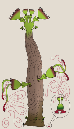 The Manus Bloom is an active plant that spends a good portion of its life unrooted. Their stalk is incredibly flexible and lets this plant move and coil like a snake. They do have roots at their very end, as they do grow from the ground as a seed. When they reach maturity, however, they uproot themselves and take on a more mobile life. The full grown ones can still bury their roots in the earth from time to time to absorb soil nutrients, or parasitically latch themselves to a much larger plant. At the other end is a impressive display of leaves, splayed wide in a hand-like arrangement. Their pink coloration causes people to think they are petals and that the whole structure is a flower, but the real bloom is not so obvious. When it is the season for flowering and pollination, a thin stalk emerges from the center of the leaves, tipped in a tiny flower. Here is where the pollen is produced, formed in sticky packets. Manus Blooms do have pollinators, typical bees and wasps, which is why the flower is positioned so far from the main body. It turns out, those leaves aren't just there to be pretty.