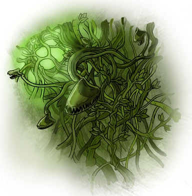 So these plants are capable of latching onto larger creatures and burning away their flesh with acidic glue. Sound horrifying? Well, we aren't done yet, as the Manus Bloom isn't always a patient hunter. With their snake-like movements and coils, they can actually choose to attack nearby creatures, launching themselves at food that is just close enough. So even if you don't physically touch one, they may decide to close the gap. This is why I said getting a closer look at one is a bad idea, as even being near them means a chance they may spring forward like a viper and grab hold. Some may dangle from branches and drop down on prey, or they may use their hand-like leaves to take a swing! Another, less elegant, name for the Manus Bloom is "Slapper," as they can whip their bodies around and slap that sticky hand onto anything within reach. And once they are on, it is almost impossible to avoid getting burned. Don't even bother trying to pull them off, it won't work. Even if you had the strength of troll, you would just rip the plant to pieces and still have them glued to your body. Instead, you need to find a knife or properly sharp object and start carving it off, doing your best to slip the blade between the plant and your skin. I will warn you, it isn't easy! Slicing it up and peeling it off is your best bet, but accept the fact that you are going to lose skin doing it. Minor burns and cuts are acceptable, when compared to having an entire chunk of your limb or body being melted off. Waiting for it to finish and drop off on its own isn't an option, unless you want to lose some weight real fast and real messily.