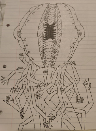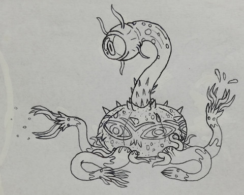 Mol'Doro was one of the seven titans created by the Gods to help build their domain and rule the mortal worlds. Their immense size and power was originally used to destroy the cities and armies of the Gods Of Dawn, a task that lasted many decades to complete. With the Gods of Dawn banished, their remaining creations and species fell to the might of the Titans and faced utter annihilation. Before their task was complete, one surviving species (falsely) warned the Titans of the new Gods, claiming that the Gods would take away their power and worlds when the job was completed. With such poisonous thoughts in their heads, they became convinced that the Gods would cheat them and give them nothing after their many years of service. Realizing the Gods were too strong to take on at the time, they continued their efforts and waited for the right moment. With the help of a traitorous Svlranix, they kept tabs on the Gods and their disputes, taking note in their quarrels and fights. At last, a time came when each God of the pantheon stood apart from each other, torn over a dispute of territory and power. The Titans struck at this time, taking out major cities and destroying sacred temples to further weaken the Gods. Planets fell to their power and the Titans claimed them and ruled over them with a harsh hand. Unfortunately, they failed to realize how such an event would unite the Gods with a common cause. With their followers and worlds in danger over this new threat, the Gods put aside their differences and retaliated with brute force. Though large and strong, the power of the Titans could not match against the united strength of the Gods. Broken and defeated, the Titans were turned to stone and buried deep into the earth, forced to remain in slumber for centuries to come.Mol'Doro was a Titan whose abilities focused more on eliminating smaller organisms and species. His fleshy foot was lined with orifices that secreted a layer of sticky slime. This goo contained a strong digestive enzyme that targeted organic materials, breaking them down into soup. He would layer the ground with this acidic slime, as well as spray fountains of it from his hose-like tendrils. This was done so that there was no escape for their smaller prey, as they would be trapped within the slime and digested. Mol'Doro would target exits and choke-off points with this slime, boxing in victims as they fled the destruction of his brothers. After exterminating the population, Mol'Doro would suck up the goo with his foot, enjoying the literal taste of victory. His brother Gptuka often consumed this slime during and after attacks, as he is immune to the juices and likes to eat pretty much everything. Along with this slime, he had two bony blades to slice and tear through large targets, and his hand-like tentacles were used for finer manipulations and tool use. The razor maw within his shell could actually be detached from his body by breaking the connecting tendrils. This mouth would automatically gnaw on the nearest object, and was often latched onto large enemies and left to consume, while Mol'Doro focused on other foes. The mouth could be easily retrieved and reconnected. Topping all this off is his shell, which was nearly indestructible. He can suck all his limbs into this shell and seal it tight, defending himself from almost any attack.