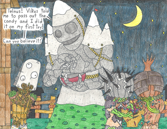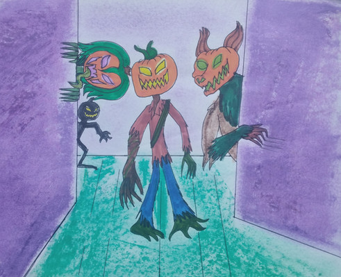 Two Pumpkin Dryads are getting ready for a night of scaring poor souls. All they need is to paint false faces, wear large black robes and than go around like some pumpkin-headed ghost to spook up the countryside.